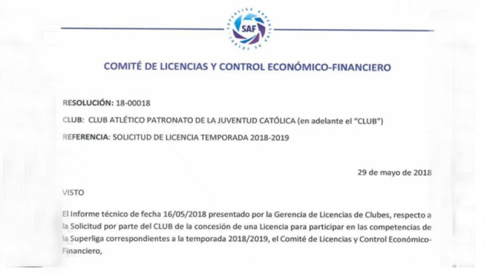 Las autoridades de la Superliga del Fútbol Argentino anunciaron que fueron entregadas licencias a 24 de las 26 instituciones que forman parte de la Primera División para disputar el próximo torneo en el máxima categorías, y uno de los clubes que recibió la habilitación fue <a href='https://d1bbwvnprfuyy6.cloudfront.net/media/resoluciones/18-00018_-_CA_Patronato_de_la_Juventud_Catolica.pdf' target='_blank'>Patronato</a>.
