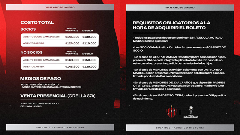 El Club Atlético Patronato lanza una venta para socios y no socios de pasajes en micro ida y vuelta para asistir al encuentro ante Botafogo el próximo miércoles 19 de julio a partir de las 19 horas en el Estadio Olímpico Nilson Santos (Río de Janeiro, Brasil) por el partido de vuelta del playoff de Octavos de Final de la CONMEBOL Sudamericana.