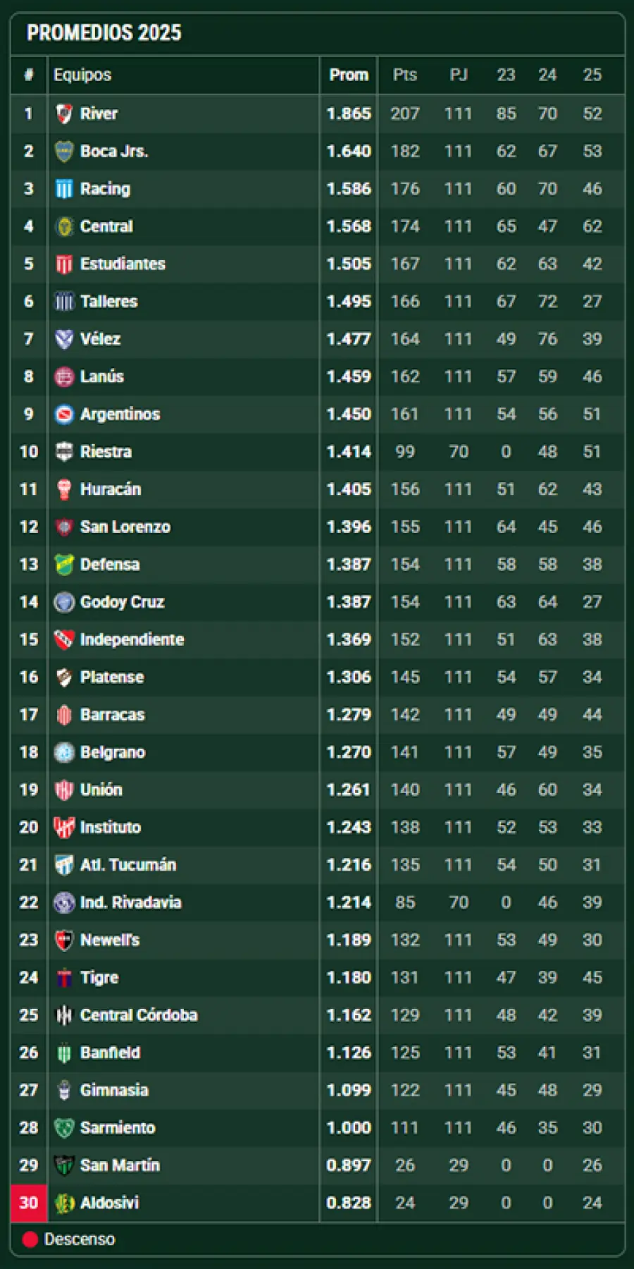 Si el campeonato terminara hoy, River iría al repechaje, y los clasificados a la Copa Sudamericana serían Argentinos y Riestra (51), Racing, Lanús y San Lorenzo (46), y Tigre (45). Al acecho se ubican Barracas (44), Huracán (43) y Estudiantes (42).