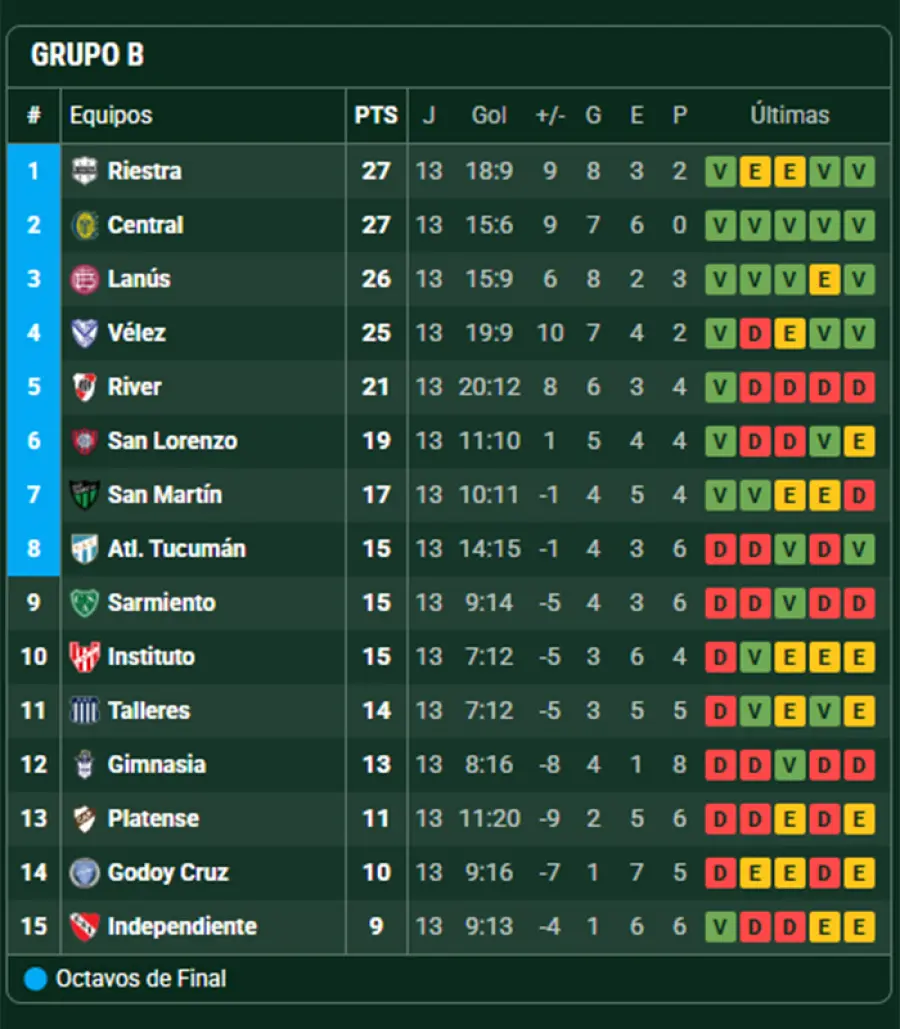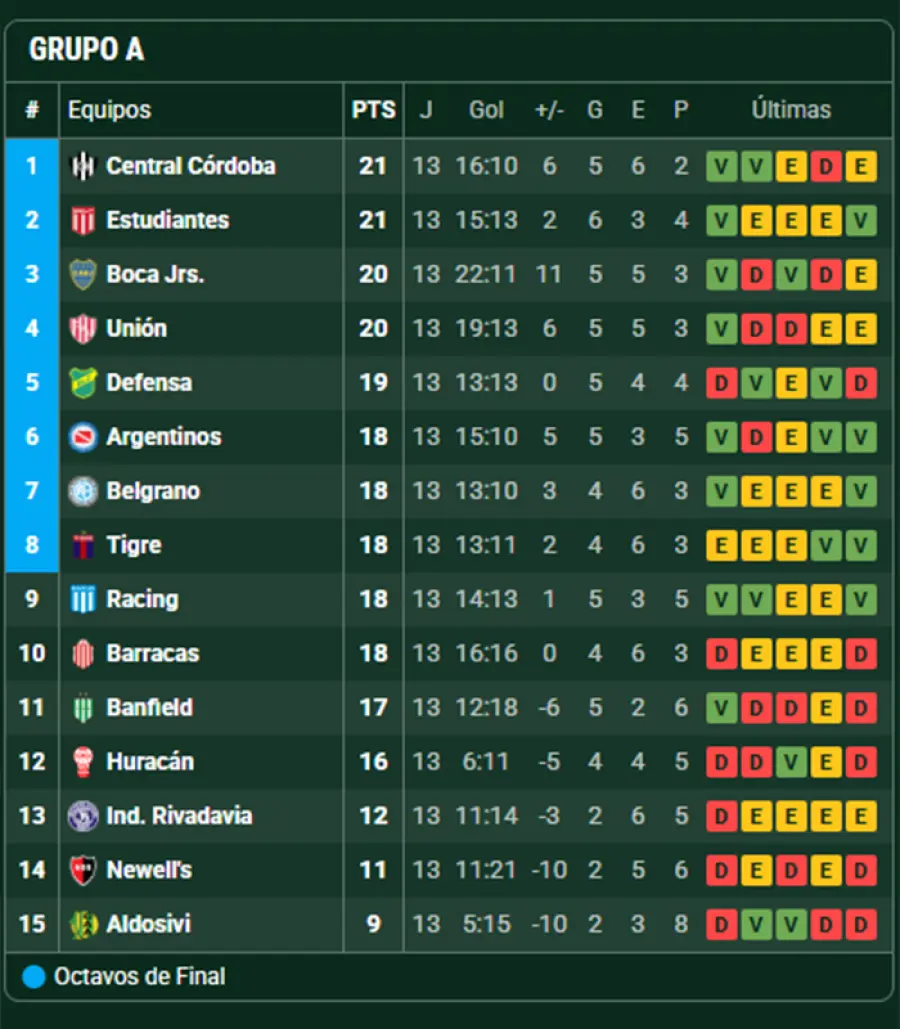 En cuanto a los playoffs, persiste la paridad en el Grupo A, con doce equipos separados por apenas cinco puntos, desde Central Córdoba y Estudiantes (21) hasta Huracán (16). En el Grupo B, el panorama es más claro: ya están clasificados Riestra y Rosario Central (27), Lanús (26) y Vélez (25).