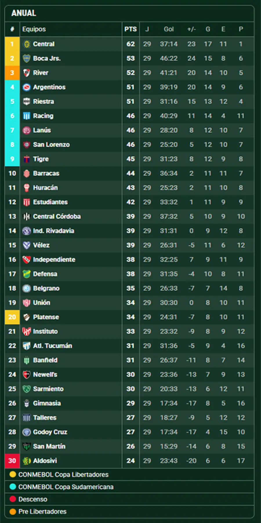 Actualmente, Rosario Central lidera la Tabla Anual con 62 puntos. Con una ventaja de 11 unidades sobre el cuarto y tres fechas por disputar, el Canalla ya tiene asegurado su lugar en el certamen continental. Detrás suyo, el panorama está más ajustado: Boca, con su triunfo sobre Barracas, subió al segundo puesto (53), desplazando a River (52), mientras que Argentinos Juniors y Riestra (51) comparten el cuarto lugar.