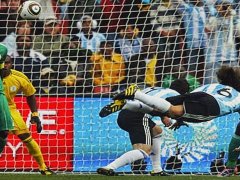 La Albiceleste tuvo su estreno en el estadio Ellis Park de Johannesburgo ante Nigeria, y fue triunfo por 1 a 0 para el elenco nacional gracias al gol señalado por el ex defensor oriundo de Crespo. A los 6 minutos de la primera mitad, y tras un tiro de esquina ejecutado por Juan Sebastián Verón, el Sonri apareció en soledad dentro del área, y con una palomita desde el punto del penal, conectó un cabezazo que terminó en el fondo de la red contraria.