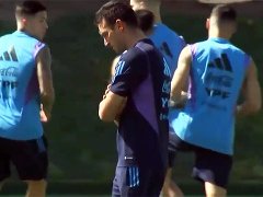 El entrenador Lionel Scaloni estuvo solo a un costado y con una pelota en los pies recorrió distancias cortas con gesto serio y pensativo.