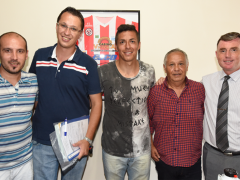 <i>Foto (UNO): </i> El defensor firmó su contrato junto a su representante el ex jugador de Boca Ariel Paez, el tesorero del Club Paraná Rodríguez Lautaro, Matías Gustavo Osuna vocal del club Paraná y Héctor Bergara secretario del Club.