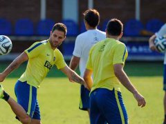 En el otro arco, los delanteros Jonathan Calleri, Andrés Chávez, Juan Manuel Martínez, Emanuel Gigliotti y Luciano Acosta se ejercitaron en el juego aéreo con pelotas paradas enviadas por Andrés Cubas y Claudio Pérez, con Agustín Orión bajo los tres palos.