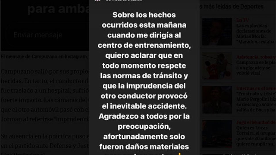 <blockquote class="twitter-tweet"><p lang="es" dir="ltr">Otro choque en <a href="https://twitter.com/hashtag/boca?src=hash&ref_src=twsrc%5Etfw">#boca</a> El futbolista <a href="https://twitter.com/hashtag/campuzano?src=hash&ref_src=twsrc%5Etfw">#campuzano</a> se la puso en Av. Libertador y Callao <a href="https://t.co/fuXUKHnR29">pic.twitter.com/fuXUKHnR29</a></p>— Sergio Marino (@marinosergio) <a href="https://twitter.com/marinosergio/status/1377595408495575042?ref_src=twsrc%5Etfw">April 1, 2021</a></blockquote> <script async src="https://platform.twitter.com/widgets.js" charset="utf-8"></script>