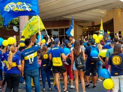 Cientos de fanáticos xeneizes, quienes no podrán estar presentes en la cancha, se agruparon en la puerta del hotel InterTower para cantar y hacerle sentir su apoyo a los dirigidos por Gustavo Alfaro.