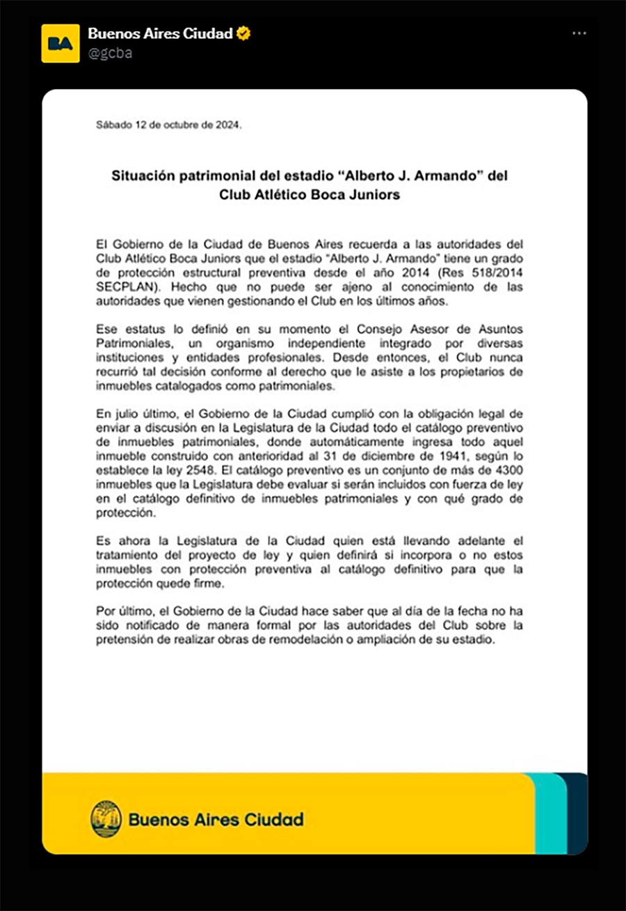 Además, el Gobierno aclaró que no recibió una notificación formal de Boca sobre planes de remodelación o ampliación del estadio, a pesar de que en agosto de 2023, el entonces presidente del club, Jorge Amor Ameal, había firmado un acta notificando a la Legislatura sobre las intenciones de refacción.