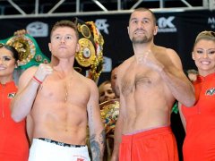 El ruso acusó en la balanza 175 libras (79.300 kg); mientras que Canelo subió a la báscula con 174.5 libras (79,100 kg). En total, son casi siete kilos más que en su pelea contra Daniel Jacobs, la última presentación oficial en mayo de este año y por el peso mediano.
