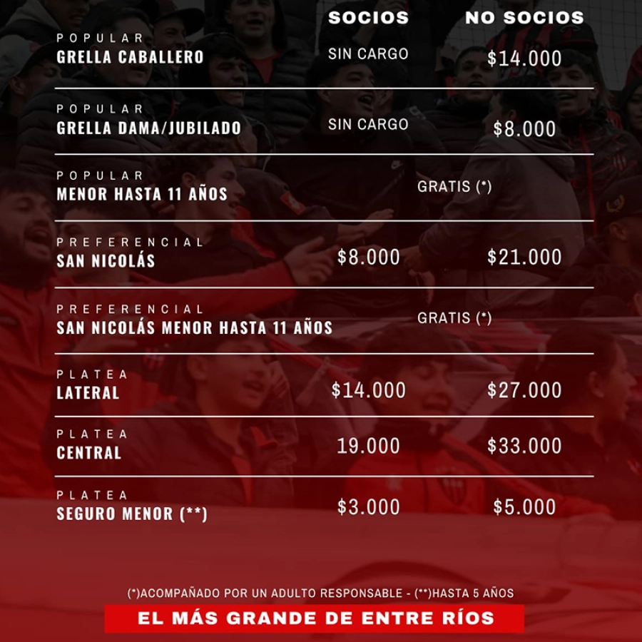 Los menores de hasta 11 años podrán ingresar de manera gratuita a la tribuna popular Grella y a la preferencial San Nicolás. Para más información o consultas relacionadas con la venta de entradas, se encuentra habilitado el canal de WhatsApp al número 343-4734354.