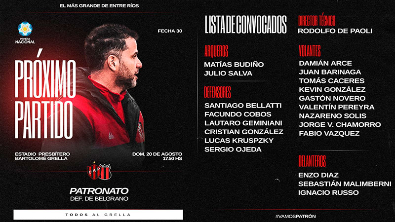 Patronato recibe a Defensores de Belgrano este domingo a partir de las 17:50 horas en el Estadio Presbítero Bartolomé Grella, en un encuentro correspondiente a la fecha 30 de la zona A del torneo de ascenso de la Primera Nacional 2023.