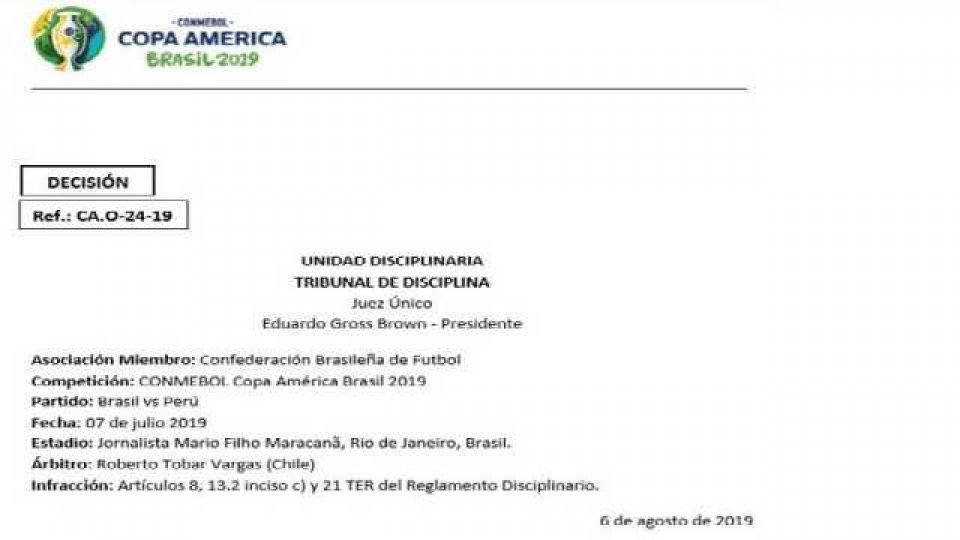 El delantero recibió una suspensión de 2 meses más una multa económica por su violenta reacción tras ser expulsado en la Final de la Copa América, mientras que la entidad brasileña deberá pagar 15 mil dólares, aunque no se reveló el motivo.