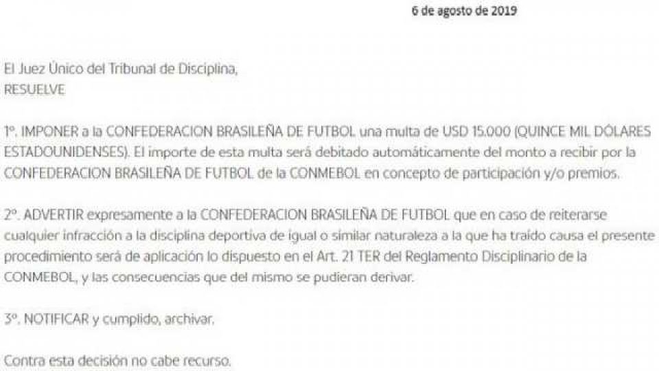 Además, la CBF deberá pagar 15 mil dólares, que serán descontados de los premios por ser campeón. En el comunicado oficial, Conmebol no dio a conocer los motivos, pero extraoficialmente se intuye que es por la presencia de Jair Bolsonaro en la celebración, algo que no está permitido.