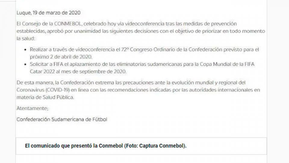 "Solicitar a FIFA el aplazamiento de las Eliminatorias sudamericanas para la Copa Mundial de Qatar 2022 al mes de septiembre de 2020", publicó a través de sus redes sociales la Conmebol.