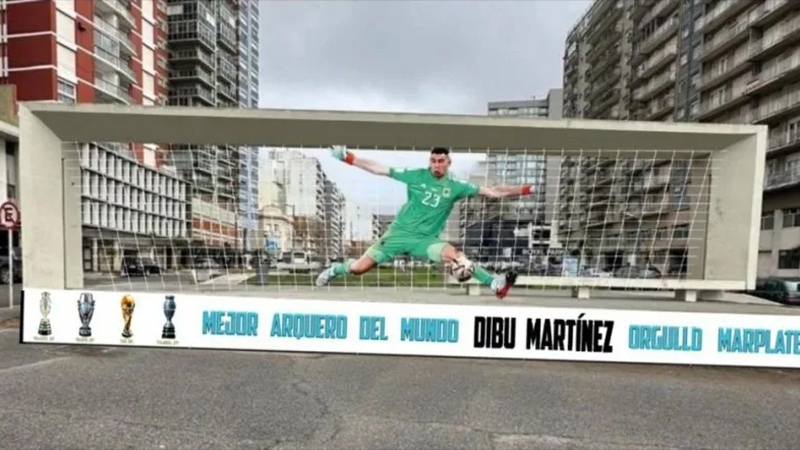 Con la victoria ante Francia en el Mundial de Qatar 2022, se capturó una gigantografía del arquero argentino, que inmortaliza la tapada a Randal Kolo Muani, sobre el final del encuentro. Ahora, dicha imagen fue actualizada en cuanto a su tamaño y mide 4,50mts por 2,70mts, lo que la vuelve un poco más grande que la anterior, que homenajeaba la actuación del marplatense en los penales ante Colombia en la Copa América 2021.