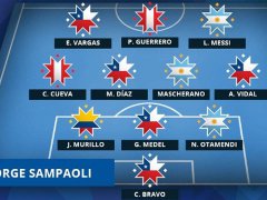 A continuación la formación completa: Claudio Bravo (Chile); Otamendi (Argentina), Gary Medel (Chile); Jeison Murillo (Colombia); Arturo Vidal (Chile), Mascherano (Argentina), Marcelo Díaz (Chile), Christian Cueva (Perú); Messi (Argentina), Paolo Guerrero (Perú) y Eduardo Vargas (Chile).