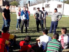 El entrenador Mario Sciacqua, el ayudante técnico Facundo Besada, el preparador físico de la Reserva Exequiel Paoloni, y los jugadores Agustín Sandona, Bruno Urribarri y Martín Aruga se hicieron presentes en el predio de la entidad auriroja, ubicado en Salvador Caputto y Jorge Newbery, para compartir experiencias tanto dentro como fuera del campo de juego y alentar a los jugadores a perseguir y alcanzar sus objetivos.