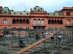 El sábado arranca en forma oficial la competencia que recorrerá Argentina, Bolivia y Chile. Operarios y personal de mantenimiento de la Casa Rosada preparan los trabajos de vallado y armado del podio para la ceremonia de largada.