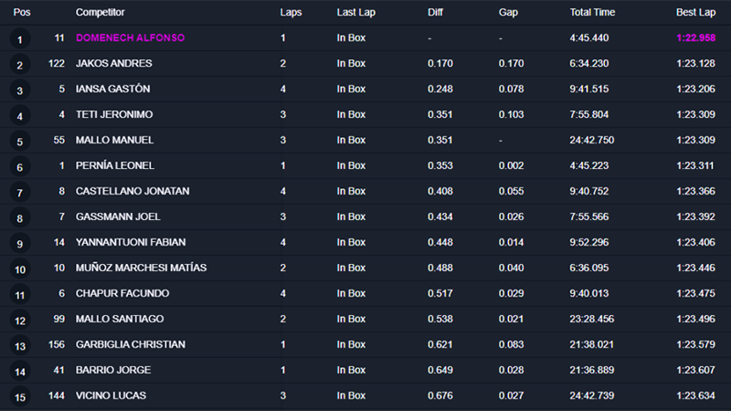 Para sumar una nueva pole en la categoría, Domenech estableció una marca de 1m.22s.958/1000 para recorrer los 3.950 metros del circuito sureño y superó a Jakos por 0.170/1000 y a Iansa por 0.248/1000.