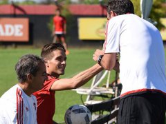 El guardametas entrerriano pasó a saludar a sus compañeros en el entrenamiento.