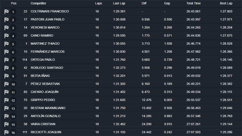 A falta de giros para la bandera a cuadros, Veronesi recuperó la punta pero el ganador 2022 en Trelew no pudo resistir el ataque de Coltrinari, quien aprovechó al máximo la succión para dar cuenta del piloto de Gualeguaychú en el frenaje de la curva 1. El entrerriano también perdió el 2º lugar con Juan Pablo Pastori (Toyota Etios), quien sumó su 7º podio en la Clase 2; Veronesi, por su parte, llegó por 5ª vez en el "top 3" de una Final.