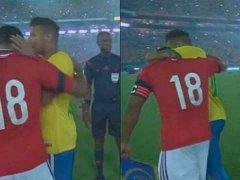 Neymar y Zúñiga se volvieron a encontrar en una cancha, luego de lo que fue aquella acción por los Cuartos de Final del Mundial de Brasil que finalizó con la fractura de una vértebra lumbar del '10' de la "Verdeamarelha", quien lejos de mostrarse rencoroso saludó al "Cafetero" y lo abrazó por unos instantes, en un claro gesto de aceptación de disculpas por la jugada que marcó la salida de la figura del Barcelona de esa competencia, no pudiendo estar en la Semifinal ante Alemania y en el Tercer Puesto ante Holanda.