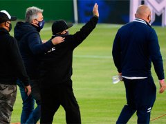 El astro y DT del elenco platense fue recibido por Tapia, Pellegrino y Tinelli. Hubo fuegos artificiales, banderas colgadas en las tribunas, una torta gigante y varios regalos. Luego se lo llevaron al vestuario por precaución.