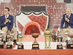 Ambas leyendas del Rojo ingresaron por el túnel y se los vio muy felices por el evento que organizó el club. Por delante tenían un escenario donde se podían ver las (muchas) copas que conquistaron en sus años de jugadores.