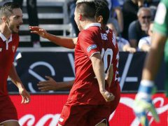 Los Nervionense, con Vázquez (quien anotó un gol), Vietto y Pareja como titulares, el ingreso de Mercado, y Kranevitter y Correa en el banco, vencieron 3 a 2 a los Pepineros, y se ubican terceros debajo del Real Madrid y el Atlético Madrid.