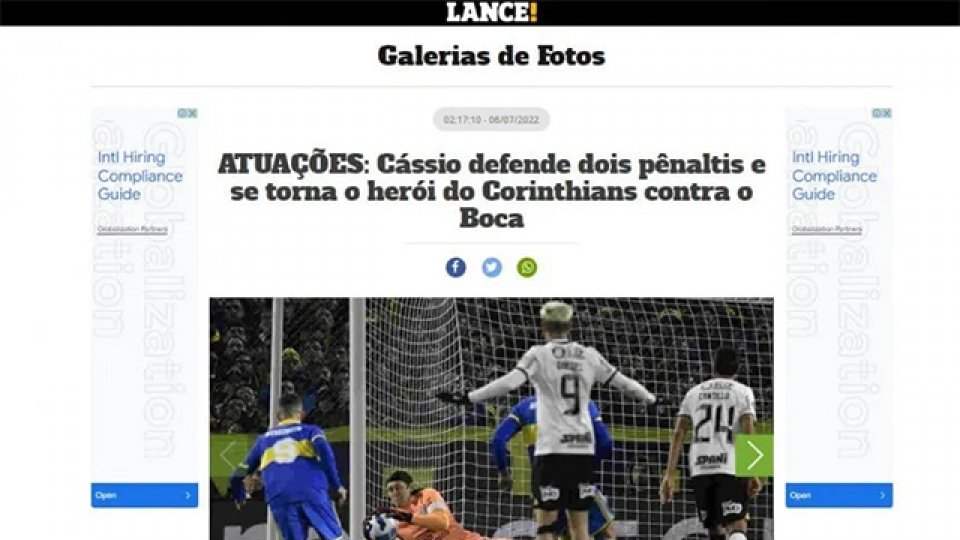 Para Gazeta Esportiva el título fue "Bendito Cassio!!" agregando "el arquero fue decisivo y Corinthians eliminó a Boca y pasó a cuartos de final".