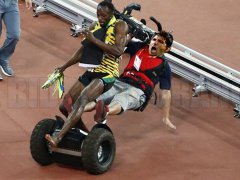 El corredor jamaiquino Usain Bolt consiguió su sexto oro consecutivo en los 200 metros (dos de los Juegos Olímpicos ?Pekín 2008 y Londres 2012? y los tres en Mundiales (Berlín 2009, Daegu 2011 y Moscú 2013) con holgura, pero la noticia pasó por el accidente que lo tuvo como involuntario protagonista. Un cámara chino lo perseguía en la celebración a bordo de su segwey, cuando involuntariamente tropezó y lo embistió de atrás con el carrito, dándole un certero y preocupante golpe en las piernas.