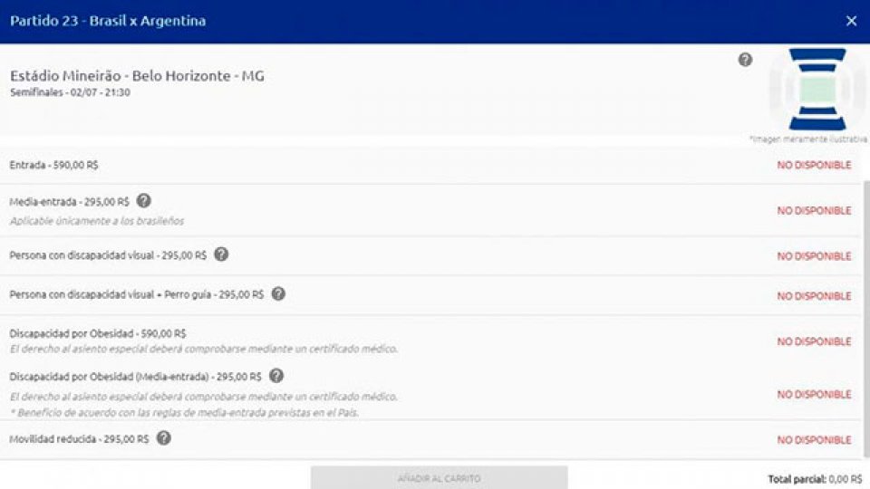 Es que este sábado al mediodía sólo quedaban las categoría 1, que son las plateas laterales. Las mismas estaban 590 reales, un número cercano a los 6.500 pesos argentinos. Pero la página oficial del torneo ya las da por vendidas, lo que deja en claro que habrá un marco de 60 mil personas alentando por las selecciones más importantes del continente.