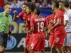 El árbitro estadounidense acorralado por los panameños.