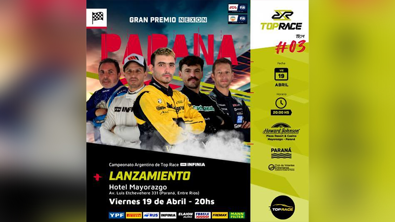 Este viernes 19 de abril a las 19.30 hs., se realizará el lanzamiento oficial de la 3º fecha del 30º Campeonato Argentino de Top Race YPF INFINIA ''Gran Premio NEXON'', que se llevará a cabo el 20 y 21 de abril en el Autódromo Ciudad de Paraná, provincia de Entre Ríos.
