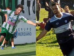 <b>Foto 1</b><i> (Archivo)</i>: Walter Cuder y César Burgos, gritando goles en Unión de Sunchales y Atlético Tala respectivamente. Ahora, figuras en el <i>Gualeyo. </i>