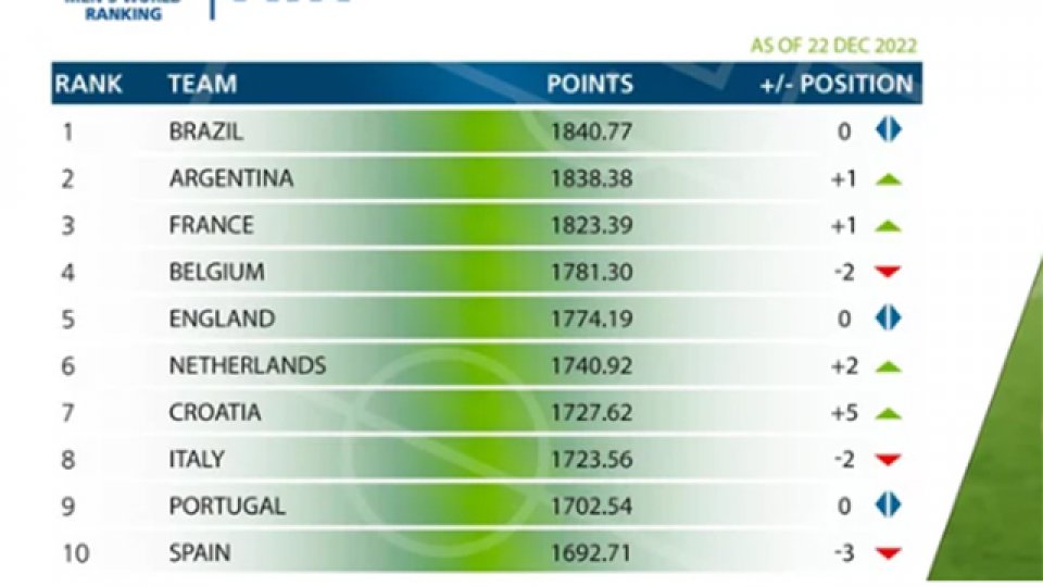 El conjunto danés cayó del top-10 y quedó en la 18º posición, mientras que es Croacia la que se coló entre los diez mejores ocupando el séptimo escalón. Dentro del top-10, otras dos grandes bajadas son las de Bélgica, eliminada en fase de grupos, e Italia, quien no se clasificó para Qatar 2022. Ambas pierden dos posiciones.