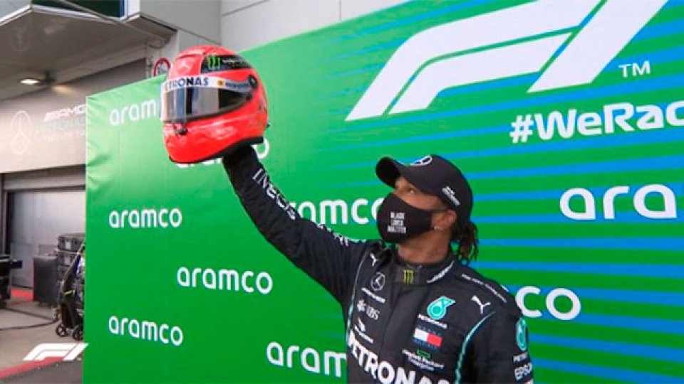<blockquote class="twitter-tweet"><p lang="es" dir="ltr">El hijo de Michael Schumacher le entrega el casco de su papá a Lewis Hamilton quien acaba de iguale su récord. Que momento ?<br><br>El niño acaba de igualar a su ídolo <a href="https://t.co/7qLpynlTsr">pic.twitter.com/7qLpynlTsr</a></p>&mdash; Analistas (@_Analistas) <a href="https://twitter.com/_Analistas/status/1315292206954098695?ref_src=twsrc%5Etfw">October 11, 2020</a></blockquote> <script async src="https://platform.twitter.com/widgets.js" charset="utf-8"></script>