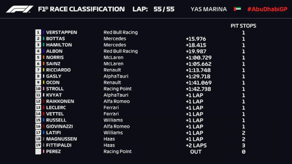 Tras 17 carreras de una temprada que inició retrasada por la pandemia, Hamilton fue el campeón con 332 puntos, el finlandés Valtteri Bottas fue subcampeón con 205 y el ganador en Emiratos Arabes quedó tercero con el Red Bull (189). El cuarto puesto, finalmente fue para el mexicano Sergio Pérez (125) y el australiano Daniel Ricciardo (112) completó el top cinco.