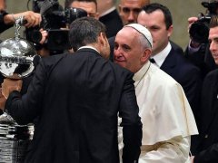 El papa recibió hoy en el Vaticano a una delegación de San Lorenzo, encabezada por el presidente Matías Lammens y el vicepresidente Marcelo Tinelli, quienes le entregaron la Copa que acaba de obtener la entidad de Boedo