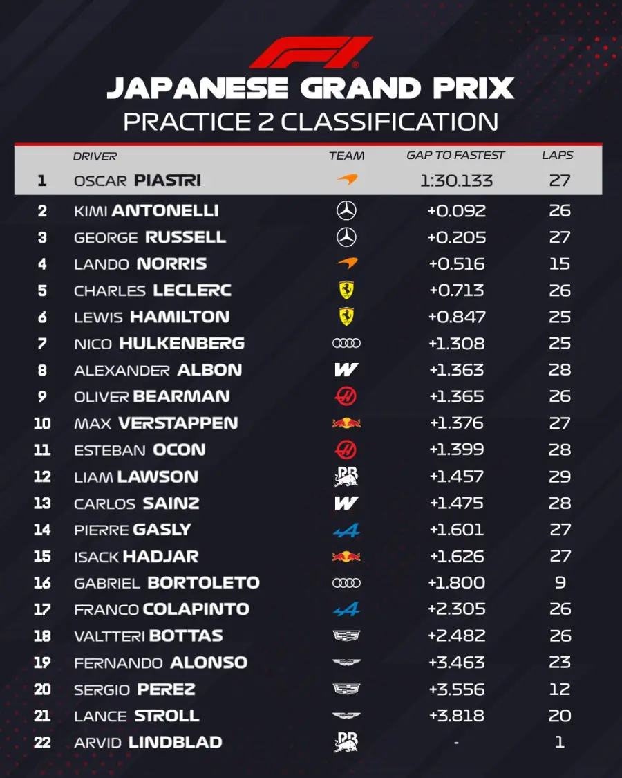 Oscar Piastri, piloto de McLaren, marcó el mejor tiempo en la segunda práctica libre del Gran Premio de Japón 2026, superando a los Mercedes. Franco Colapinto finalizó en el puesto 17, mientras que Sergio “Checo” Pérez terminó 20°, tras perder media hora por reparaciones en su auto.