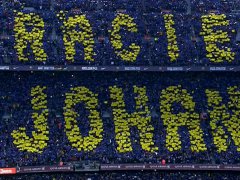 En la previa al duelo entre Barcelona y Real Madrid, los hinchas del club catalán exhibieron un enorme mosaico conmemorativo por el fallecimiento de la leyenda holandesa que dejó su marca en el Barsa, además se hizo un minuto de silencio.