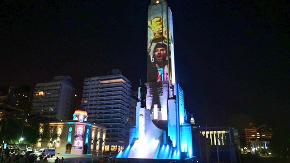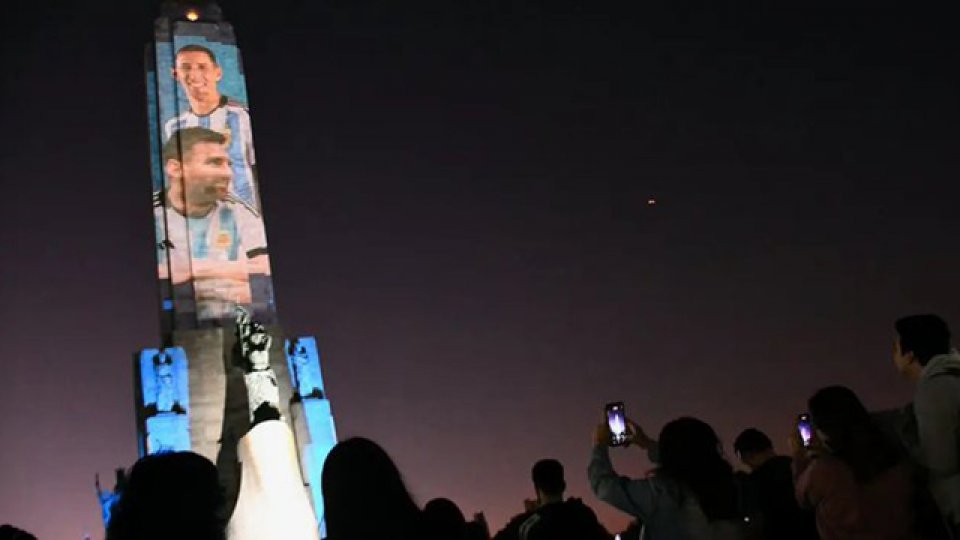 El municipio de Rosario realizó anoche un espectáculo homenaje multimedia, de luces y sonidos, que incluyó la proyección sobre el Monumento Nacional a la Bandera de los futbolistas rosarinos campeones del mundo en Qatar 2022, Lionel Messi y Angel Di María.