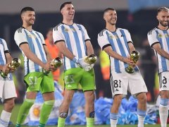 Dibu repitió la celebración que había realizado por primera vez en la Copa América y había vuelto a hacer en el Mundial al ganar el 'Guante de Oro', ahora con el trofeo de la Copa del Mundo y en compañía de Guido Rodríguez, Marcos Acuña, Gerónimo Rulli y Germán Pezzella, quienes son alguno de los más cercanos a él dentro del plantel.