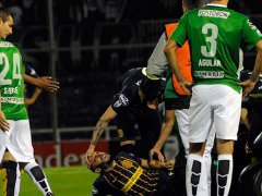 penas había comenzado el encuentro, y en una de las primeras jugadas, Javier Pinola salió a trabar una pelota en campo de Atlético Nacional de Medellín; en una acción temeraria, el defensor de Rosario Central sufrió un planchazo de Aguilar, del equipo colombiano, y el que peor parte llevó fue el zaguero argentino, que poco después, entre lágrimas, tuvo que ser reemplazado por Pablo Álvarez.
