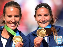 El festejo de la nogoyaense Gallay y su compañera al obtener la presea dorada. Foto 2 de 2