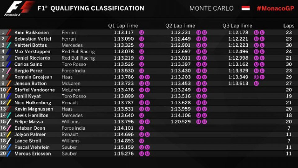 Kimi Raikkonen volvió a obtener una pole position en la Fórmula 1. El finlandés, sobre la Ferrari, consiguió además el nuevo record para el escenario del principado gracias al tiempo de 1:12.178. La escudería italiana cerró una excelente jornada, con un 1-2 tras el segundo lugar de Sebastian Vettel que les posibilita ocupar la primera fila de la grilla de mañana.