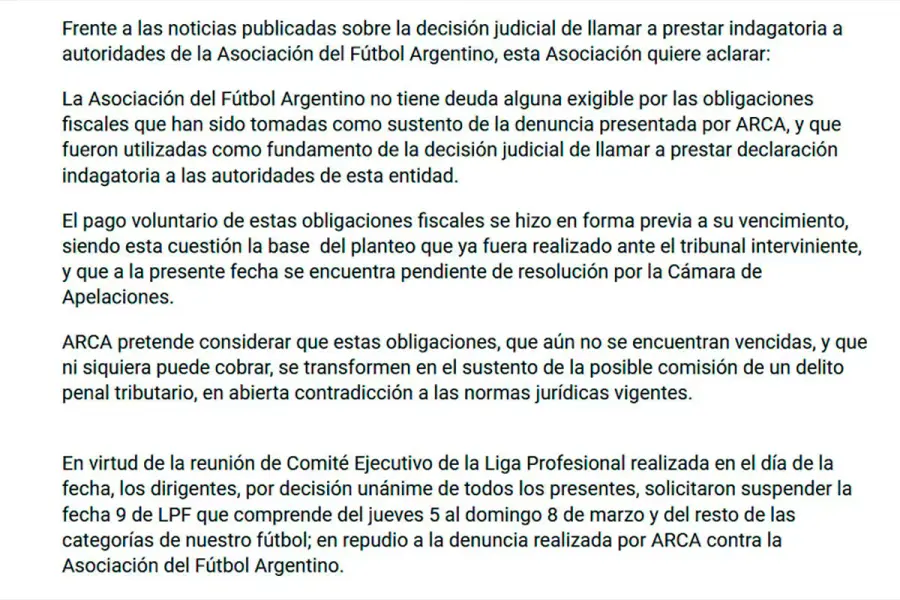 La Asociación del Fútbol Argentino (AFA) emitió un comunicado en respuesta a la decisión judicial de citar a declarar indagatoria a sus autoridades en una causa que investiga presuntas irregularidades fiscales.