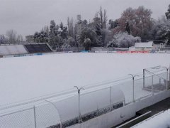 El campo de juego del conjunto local está completamente tapado por nieve. Las personas de utiliería del club están trabajando para sacar la nieve antes de las 16, que es la hora de inicio del duelo.