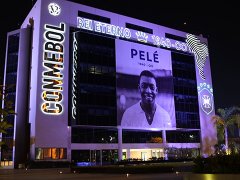 La Confederación Sudamericana de Fútbol (Conmebol) iluminó esta noche el frente y los laterales de su sede en Luque, Paraguay, de color violeta y con una gran imagen de Pelé, para homenajear al astro futbolístico brasileño fallecido este jueves.