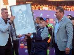 Diego Maradona fue recibido en el Coloso como un verdadero héroe en la previa del partido entre Newell´s y Gimnasia. En medio de una ensordecedora ovación, le obsequiaron un cuadro, descubrieron un mural y Maximiliano Rodríguez le regaló la cinta de capitán.
